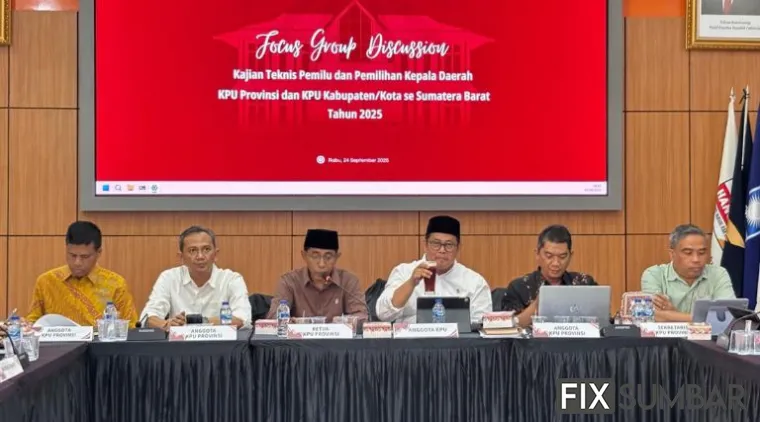 PADANG - Komisi Pemilihan Umum (KPU) Sumatera Barat (Sumbar) menggelar Focus Group Discussion (FGD) Kajian Teknis Pemilu 2025 dengan menyoroti empat isu strategi, mulai dari penataan daerah pemilu, penyederhanaan surat suara, keabsahan dokumen pencalonan, hingga pemanfaatan teknologi dalam perhitungan suara, Rabu (24/9/2025).