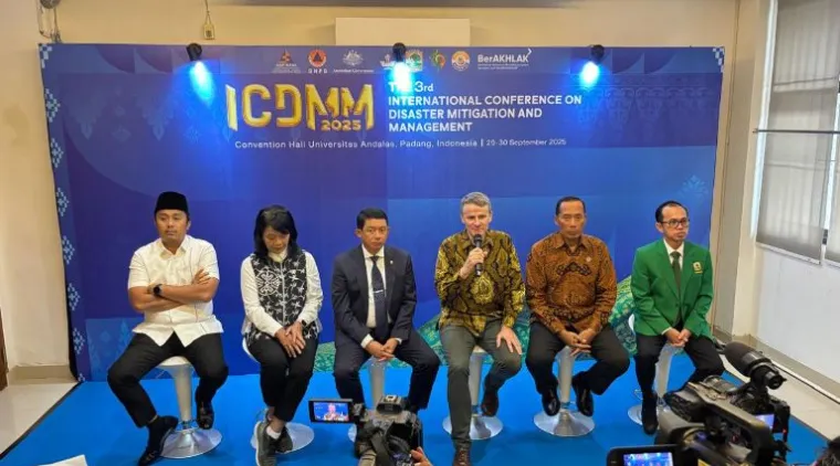 PADANG - Konferensi Internasional Ketiga tentang Mitigasi dan Manajemen Bencana (ICDMM) resmi dibuka di Universitas Andalas (Unand) Padang, Senin (29/9/2025). Acara ini dihadiri Duta Besar Australia untuk Indonesia, Rod Brazier, Kepala Badan Nasional Penanggulangan Bencana (BNPB) Letjen TNI Dr. Suharyanto, Wakil Menteri Pendidikan Tinggi, Ilmu Pengetahuan, dan Teknologi, Prof. Fauzan, Wakil Menteri Pekerjaan Umum, Diana Kusumastuti, serta Wakil Gubernur Sumbar, Vasko Ruseimy.