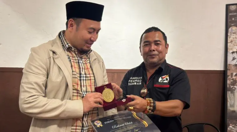 PADANG - Rahmat Saleh menerima Medal of Honor dari Jaringan Pemred Sumbar (JPS) pada Kamis (2/4/2026) malam, usai pelantikan pengurus JPS periode 2025-2028 yang telah dikukuhkan pada hari yang sama. Penyerahan penghargaan tersebut berlangsung di sebuah kedai kopi di kawasan Jalan Pontianak Nomor 1, Padang.