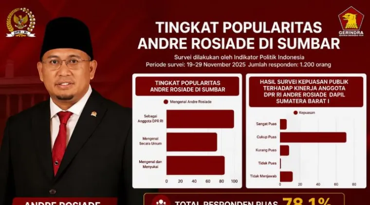 “Alhamdulillah, hasil survei ini menjadi penyemangat bagi saya untuk terus bekerja maksimal bagi masyarakat Sumatera Barat,” tulis Andre melalui akun media sosialnya, Senin (27/4/2026).